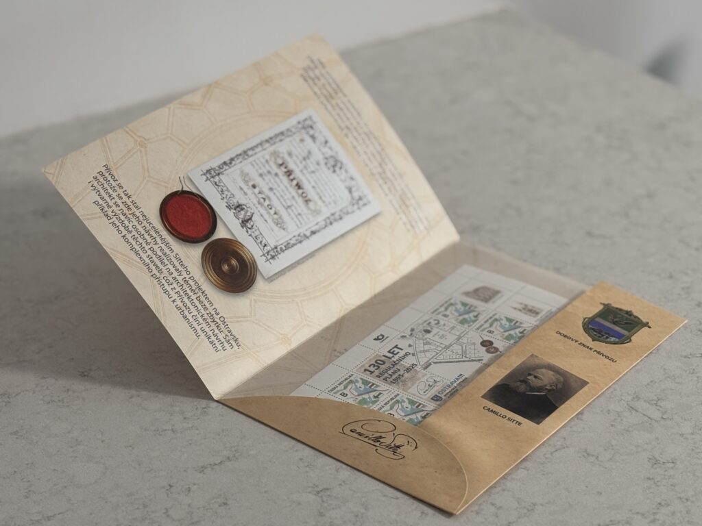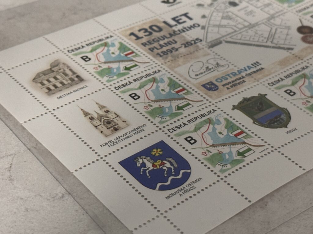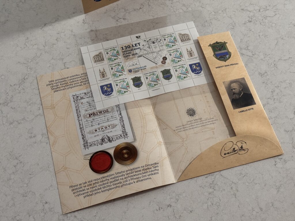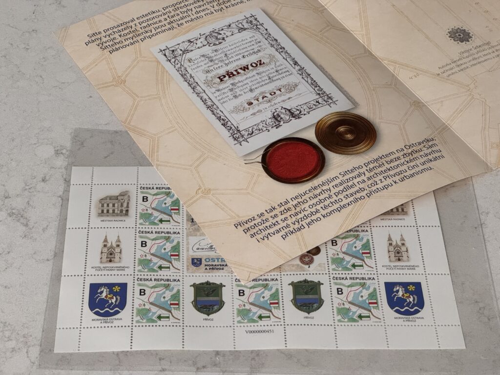 Na tiskovém listu se objevují dva motivy, které charakterizují jak velikost architekta, tak význam Přívozu v době jeho rozmachu: radnice a kostel Neposkvrněného početí panny Marie. Obě díla v tužce nakreslila mladá výtvarnice Viktorie Šebestová.